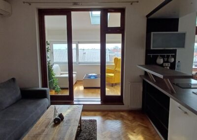 Dispozične pozostáva z obývačky spojenej s menšou kuchyňkou, spálne, kúpeľne so sprchovacím kútom spojenej s WC a veľkej presklenej terasy, na ktorú je východ z každej miestnosti.