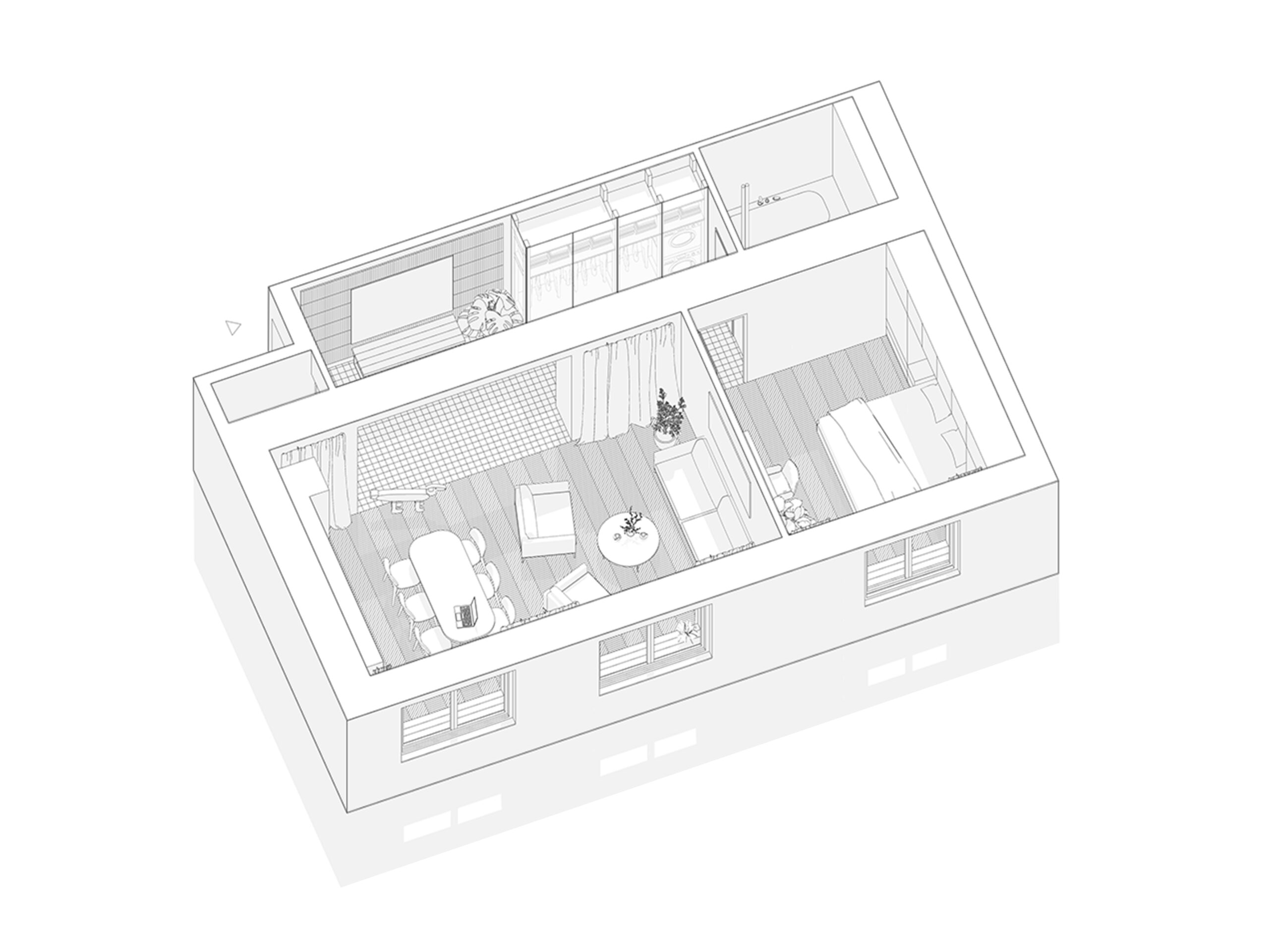 - Pozostáva zo vstupnej chodby, kuchyne spojenej s obývačkou, spajze, spálne a kúpeľne spojenej s WC.